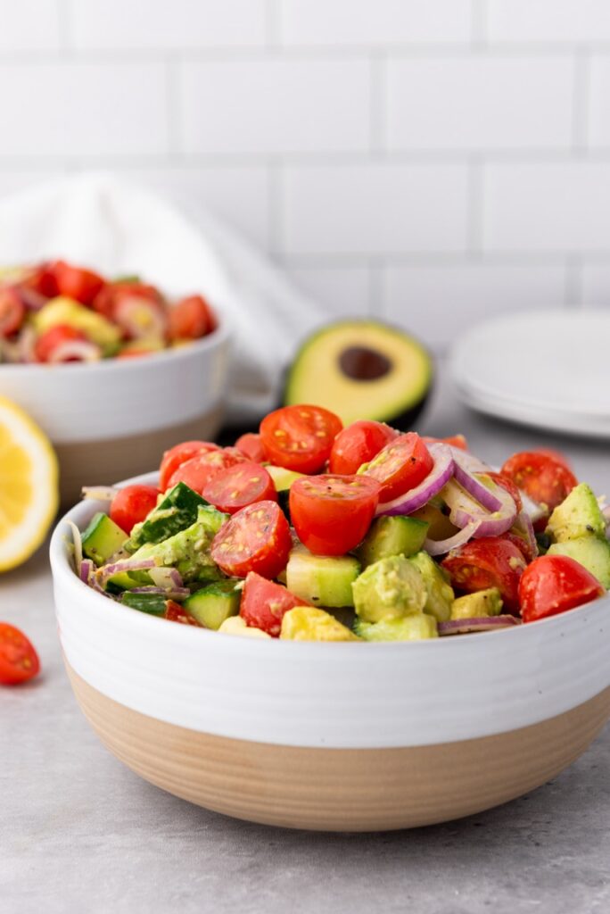 - Toss the cucumber, tomatoes, red onion, and avocado in a large bowl.
