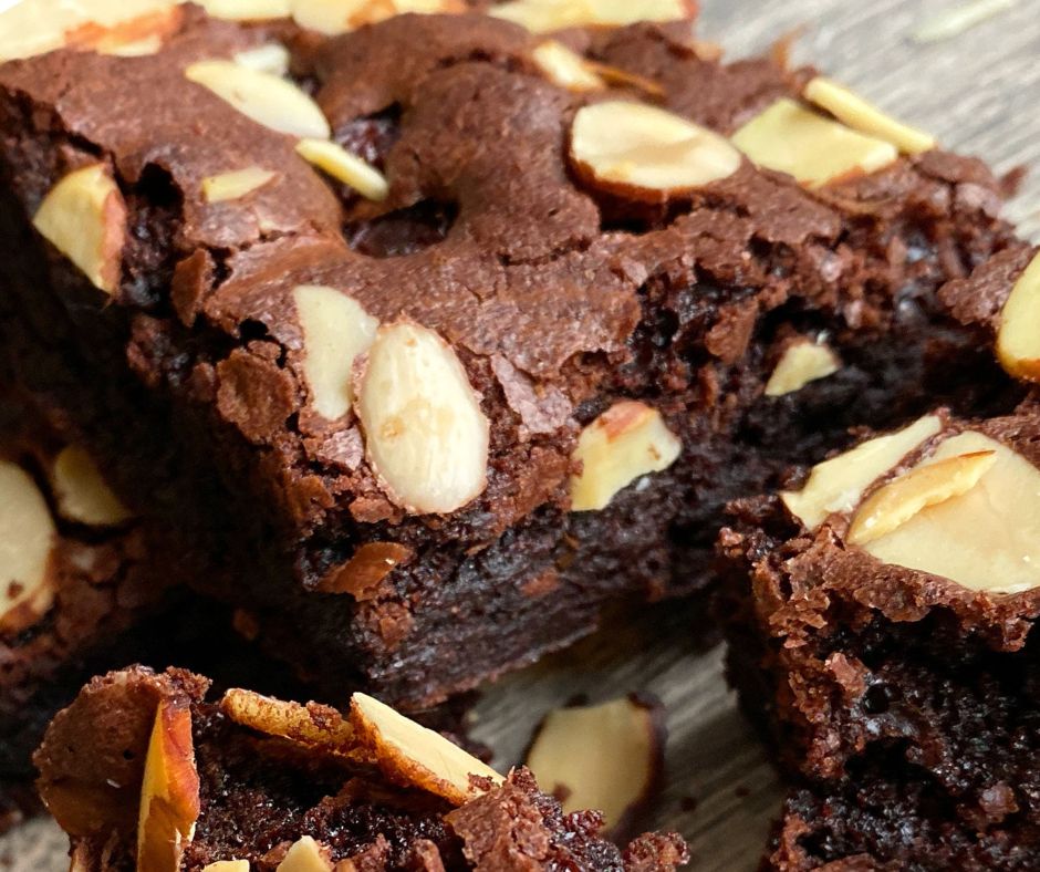 6. Pour brownie mixture into a greased, 9X13 pan and spread evenly. Sprinkle sliced almonds on top.